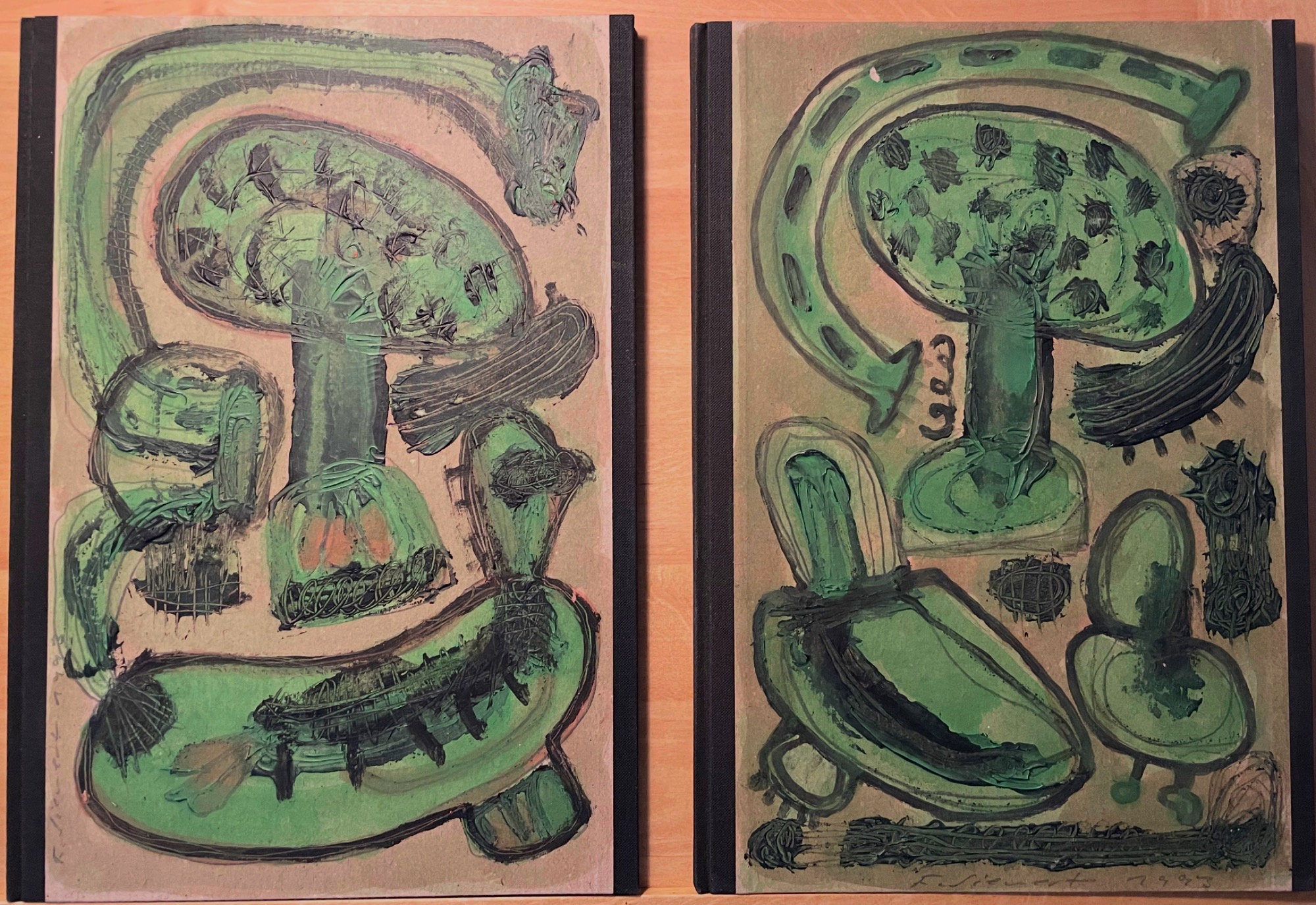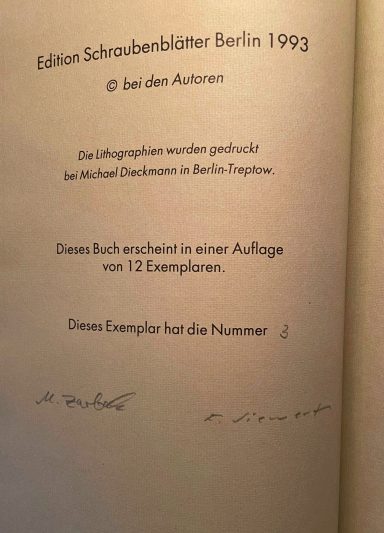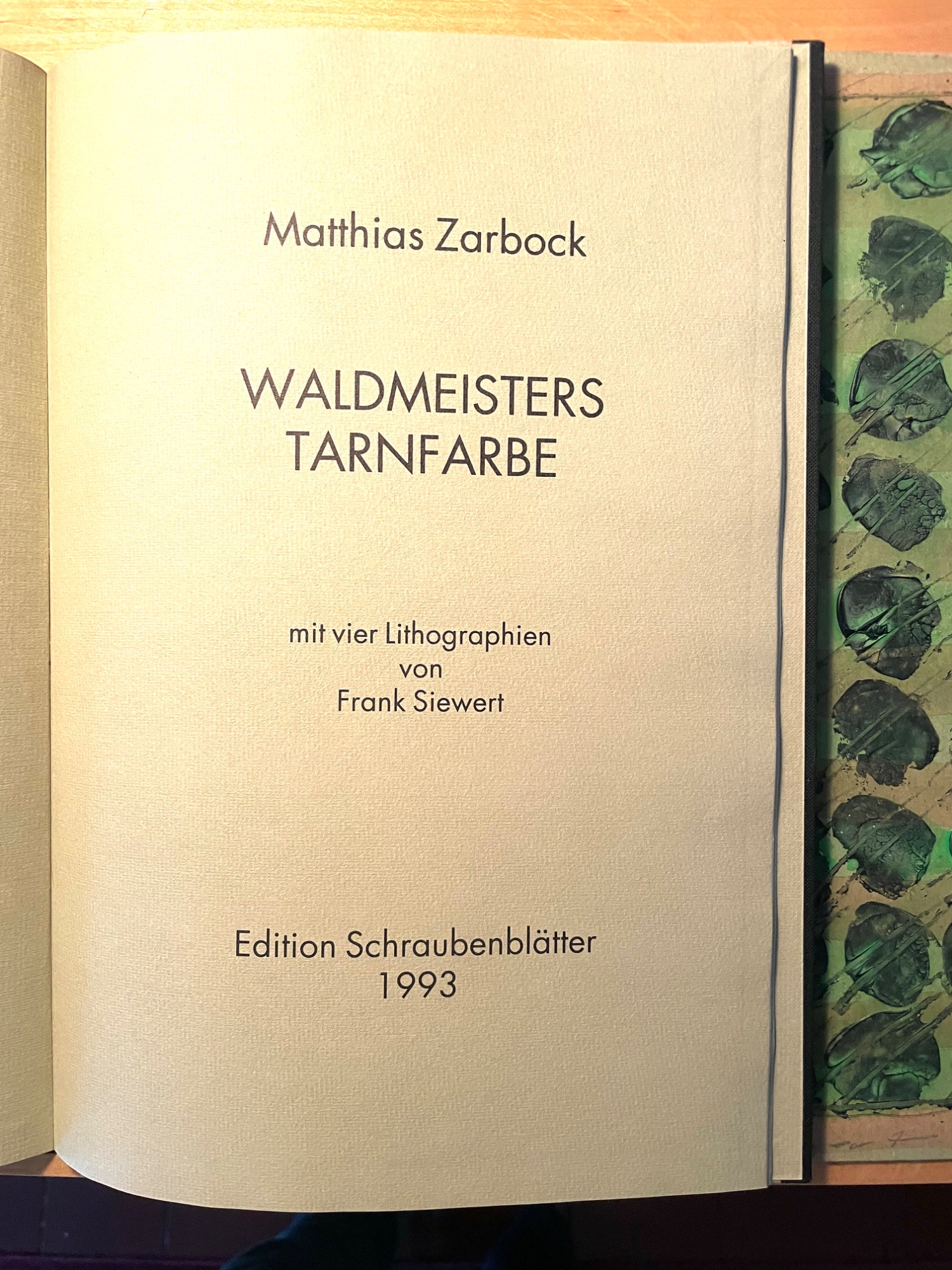 Experimenteller Text und Lithografien von Frank SiewertMit vier Lithographien und Umschlaggestaltung von Frank Siewert. Berlin: Edition Schraubenblätter, 1993. [9 Bl.] enthält: Waldmeisters Tarnfarbe