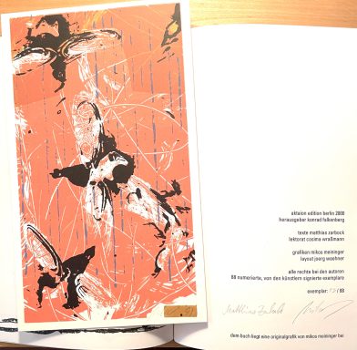Mit Grafiken von Mikos Meininger. Hrsg. von Konrad Falkenberg. Berlin: Aktaion Edition, 2000. [27 Bl.]